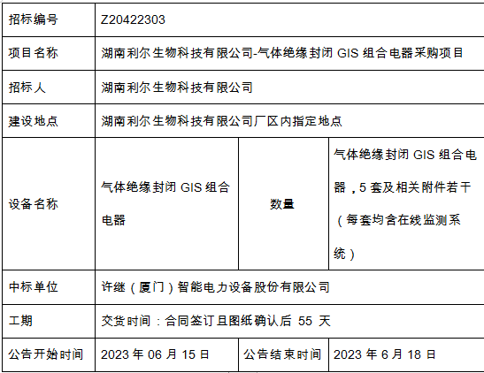關(guān)于Z20422303-湖南利爾生物科技有限公司-氣體絕緣封閉GIS組合電器公開招標(biāo)采購結(jié)果公示:招標(biāo)編號(hào)Z2042...